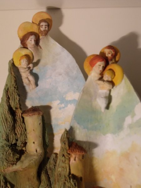 The Nativity scenes have moved away from the conventional model. The Virgin Mary is represented as Mother, in various moments of everyday life. We see her leaning on Joseph’s shoulder, as she places his hand on her tummy to feel the baby move inside her. We find her with a bowls in one hand as she plays with her Son and Husband. The strange-looking Magi sometimes follow the Holy Family, mounted on camels or horses, and on elephants, buffalo and zebu. Mary is always the dominant figure, and motherhood is her triumph as a woman, aside from her divine nature. Other Nativities are found on the circle of painted panels.